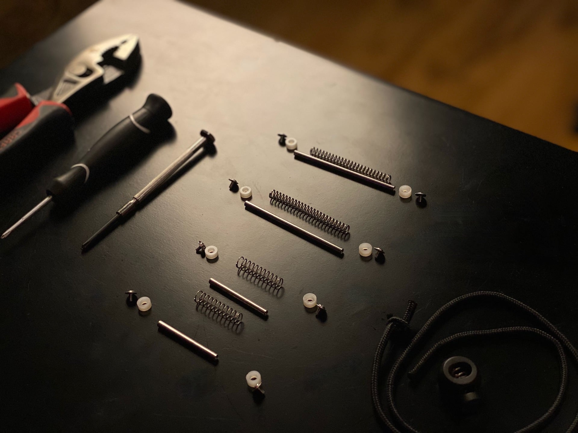 Each rod is a high-quality steel part, tapped and threaded at each end for a washer-head screw. In between are two nylon washers and the spring.