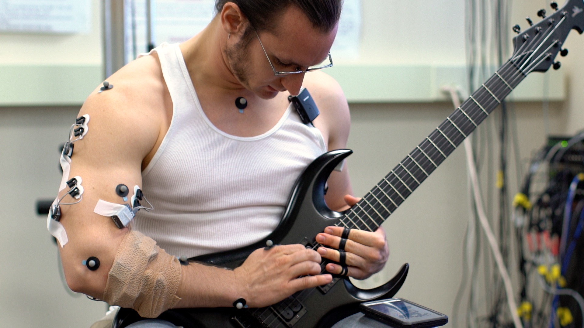 Setting up for elbow motion usually involves one of two distinct forms that you can learn to recognize, even from a distance. Brendon Small uses the straight form, where the forearm rests on the guitar body, and the forearm and wrist point in the same direction: